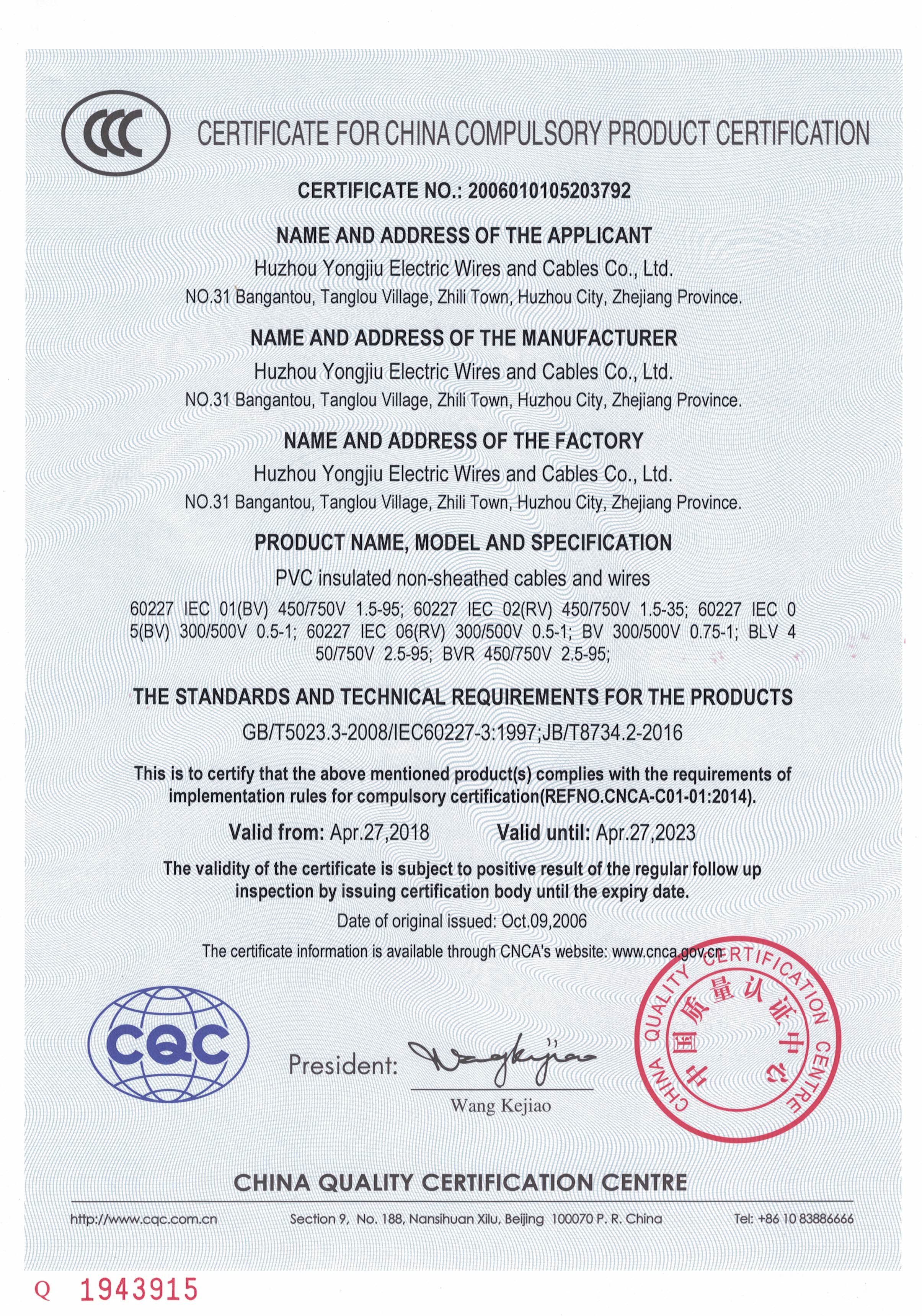 2005年, 在王阿志董事長的帶領下,經過10年的不斷的努力和堅持,浙江永久電纜有限公司--正式注冊成立。